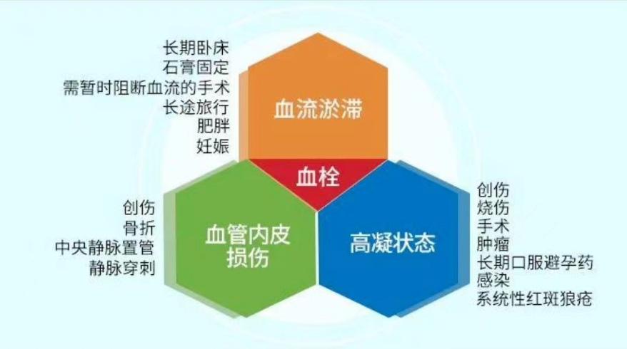 DVT 和 PTE 具有共同的危险因素,即 VTE的危险因素,包括任何可以导致静脉血液淤滞、静脉系统内皮损伤和血液高凝状态的因素,即 Virchow 三要素。